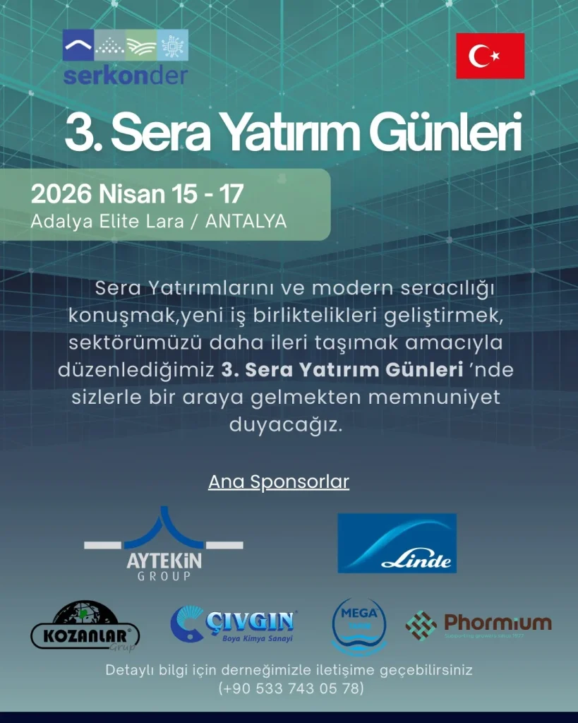 SERKONDER tarafından düzenlenen 3. Sera Yatırım Günleri, sera yatırımları ve modern seracılığın geleceğini konuşmak, yeni iş birlikleri geliştirmek ve sektörümüzü daha ileri taşımak amacıyla sektörün önde gelen temsilcilerini, yatırımcıları ve profesyonelleri bir araya getiriyor.